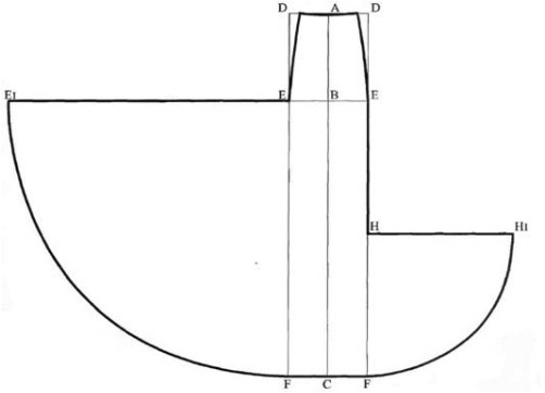 Проводим вертикальную линию и перпендикуляр к ней через точку О. ОА = ОА 1 = радиус = 1/2 обхвата талии /3,14/ (4/4). (Пример: 70 см/2/3,14/(4/4) = 11,15 см.) Дуга АА 1 = полуобхват талии. АВ = А1В1 = длина юбки (Ди ). (Пример: 50 см. Подробнее...